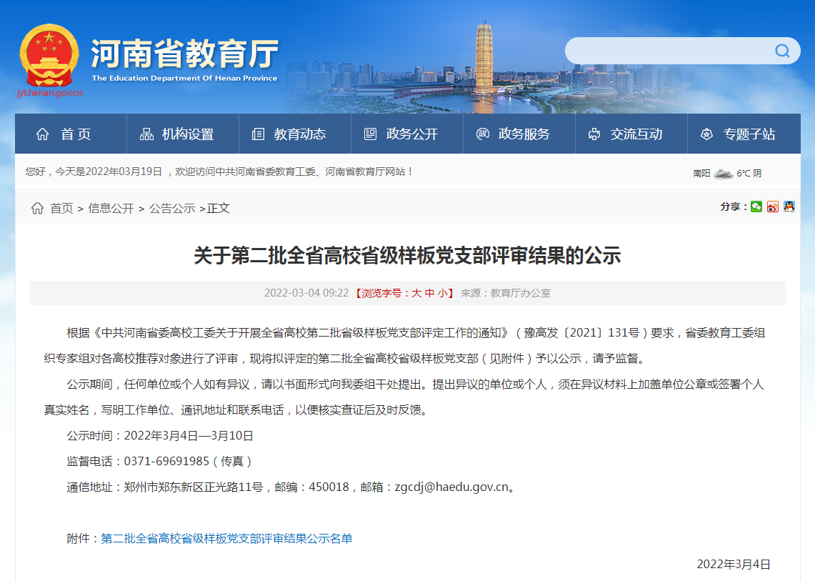 近日,中共河南省委教育工委下发《关于公布第二批全省高校省级样板党支部评审结果的通知》(豫教工委〔2022〕11号),我校机械工程学院数控专业党支部被评为“第二批全省高校省级样板党支部”。近年来,学校坚