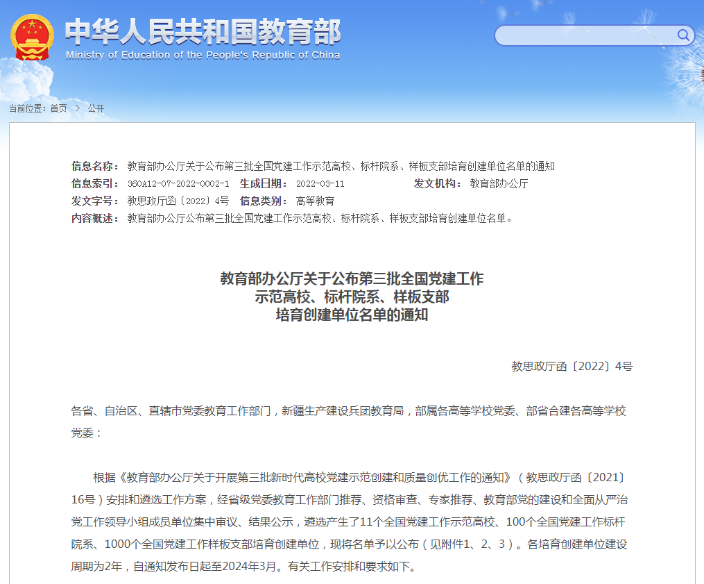 近日,教育部办公厅印发《关于公布第三批全国党建工作示范高校、标杆院系、样板支部培育创建单位名单的通知》(教思政厅函〔2022〕4号),学校建筑工程学院装饰设计专业党支部被评为第三批“全国党建工作样板支