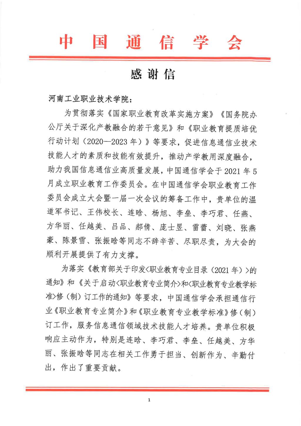 近日,中国通信学会向学校发来感谢信,对学校大力支持中国通信学会职业教育工作表示真诚的感谢和由衷的敬意。在中国通信学会职业教育工作委员会成立大会暨一届一次会议的筹备工作中,学校党委书记温道军、校长王伟,