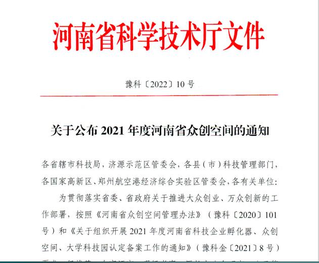 1月24日,河南省科技厅公布了2021年度河南省众创空间备案评审结果,我校南都众创空间顺利通过评审,获批河南省众创空间,这标志着我校创新创业工作又进入了一个新阶段。河南省众创空间是指在河南省范围内创办