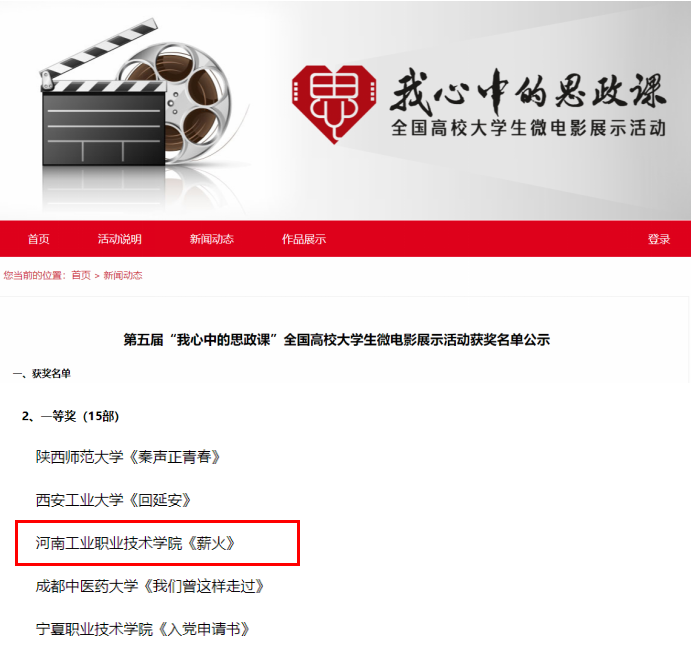 我校荣获教育部“我心中的思政课——第五届全国高校大学生微电影展示活动”一等奖