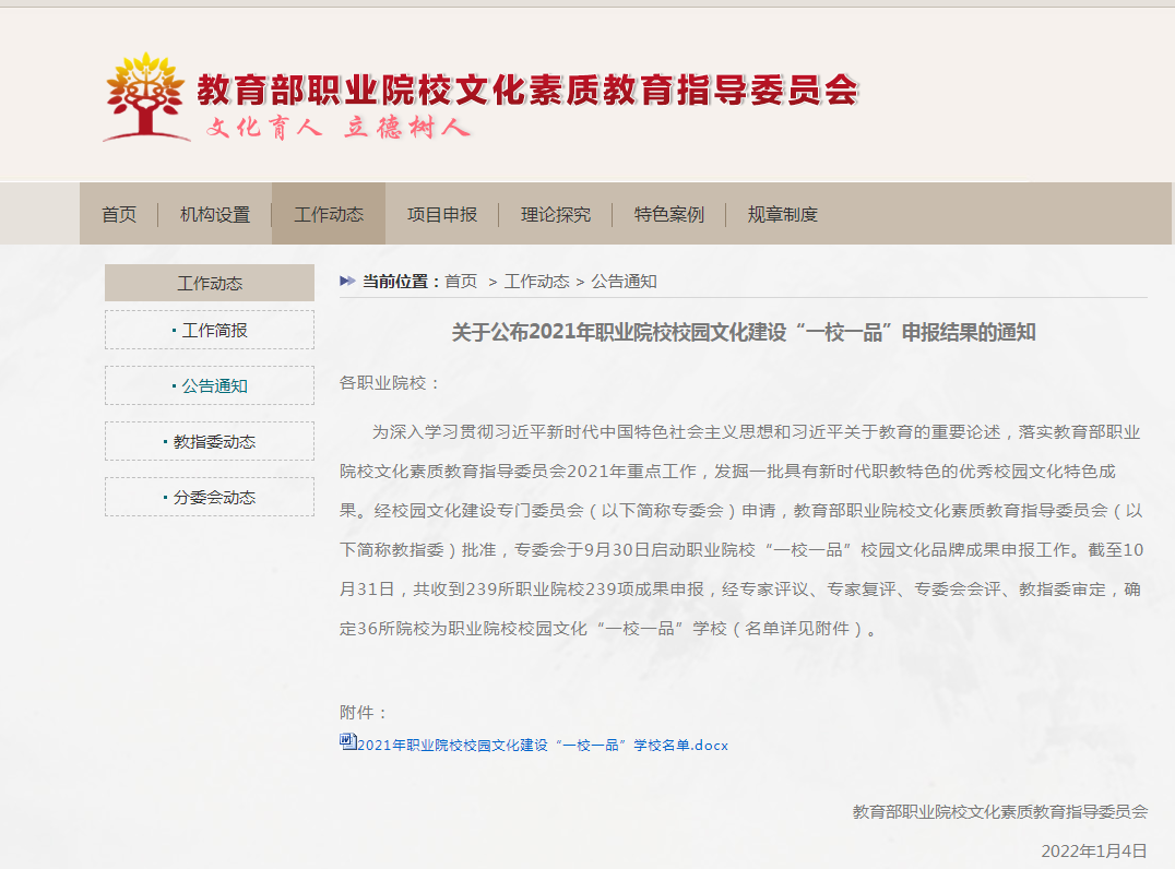 1月4日,教育部职业院校文化素质教育指导委员会公布了2021年全国职业院校校园文化建设“一校一品”评选结果,我校申报的“军工文化”校园文化品牌成果,经专家评议、专家复评、校园文化建设专门委员会会评、教