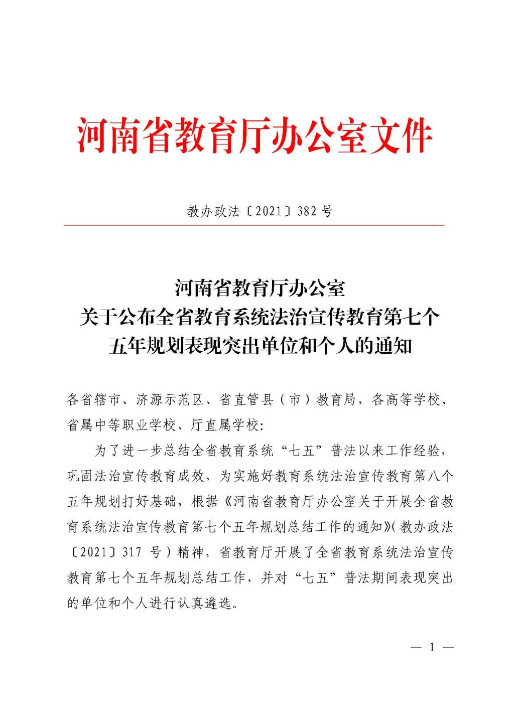 近日,河南省教育厅印发《关于公布全省教育系统法治宣传教育第七个五年规划表现突出的单位和个人的通知》,对“七五”普法期间表现突出的单位和个人进行表彰。经单位推荐、专家评审、综合评议、征求意见、公示等环节