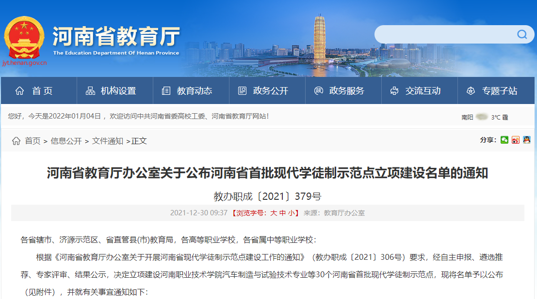 近日,河南省教育厅发布了《关于公布河南省首批现代学徒制示范点立项建设名单的通知》(教办职成〔2021〕379号),我校建筑装饰工程技术专业被确立为河南省现代学徒制示范点。近年来,我校依托5个全国首批现