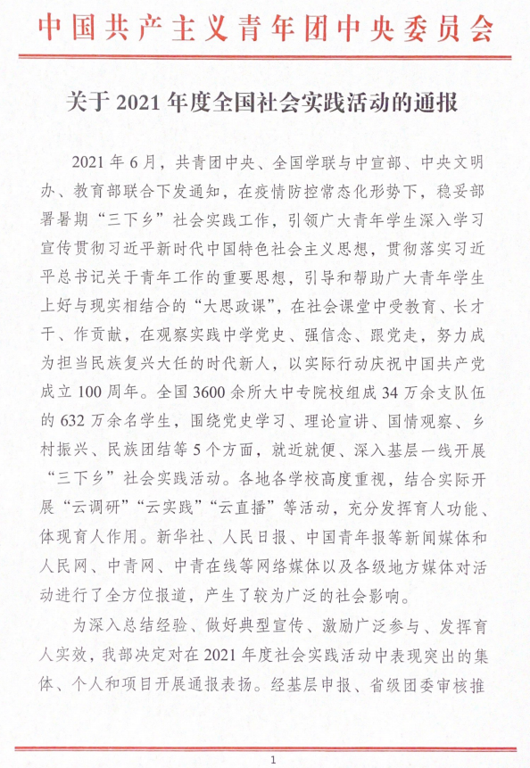 为深入总结经验、做好典型宣传、激励广泛参与、发挥育人实效,近期,团中央对在2021年度社会实践活动中表现突出的集体、个人和项目开展了总结通报工作。经基层申报、省级团委审核推荐、组织评议等环节,最终遴选