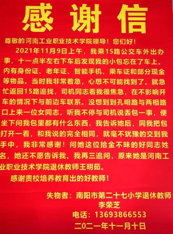 近日,我校收到一封来自南阳市第二十七小学退休教师李荣芝的感谢信,信中高度赞扬了我校退休职工王明茹拾金不昧的高尚品格以及助人为乐的雷锋精神。11月9日上午,我校退休职工王明茹在乘坐15路公交外出时,发现