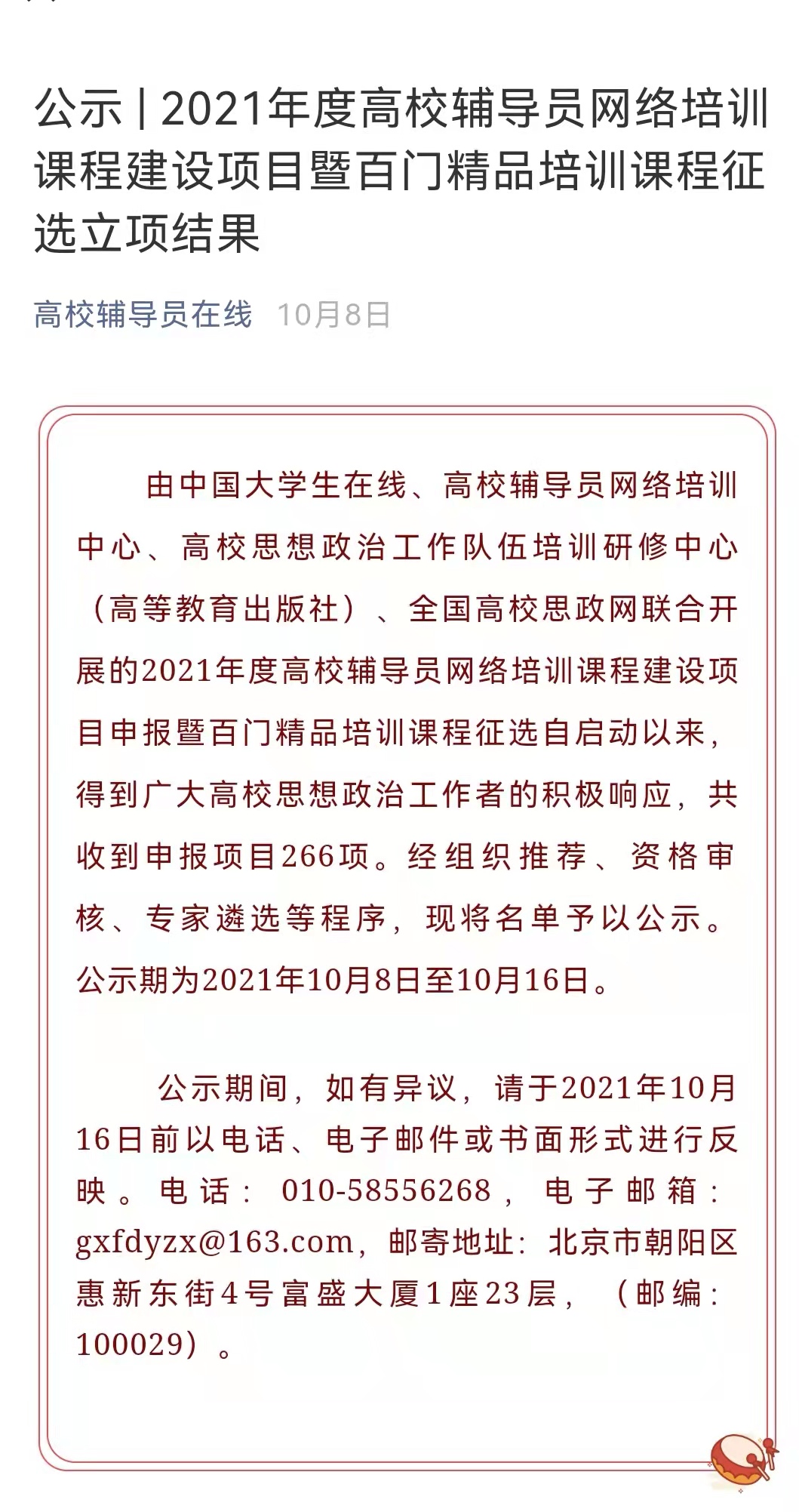 我校项目成功入选2021年度高校辅导员网络培训课程建设项目暨百门精品培训课程立项