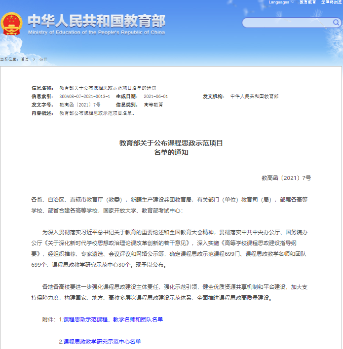 2021年6月10日,教育部印发《关于公布课程思政示范项目名单的通知》(教高函〔2021〕7号),确定课程思政示范课程699门、课程思政教学名师和团队699个、课程思政教学研究示范中心30个,其中普通