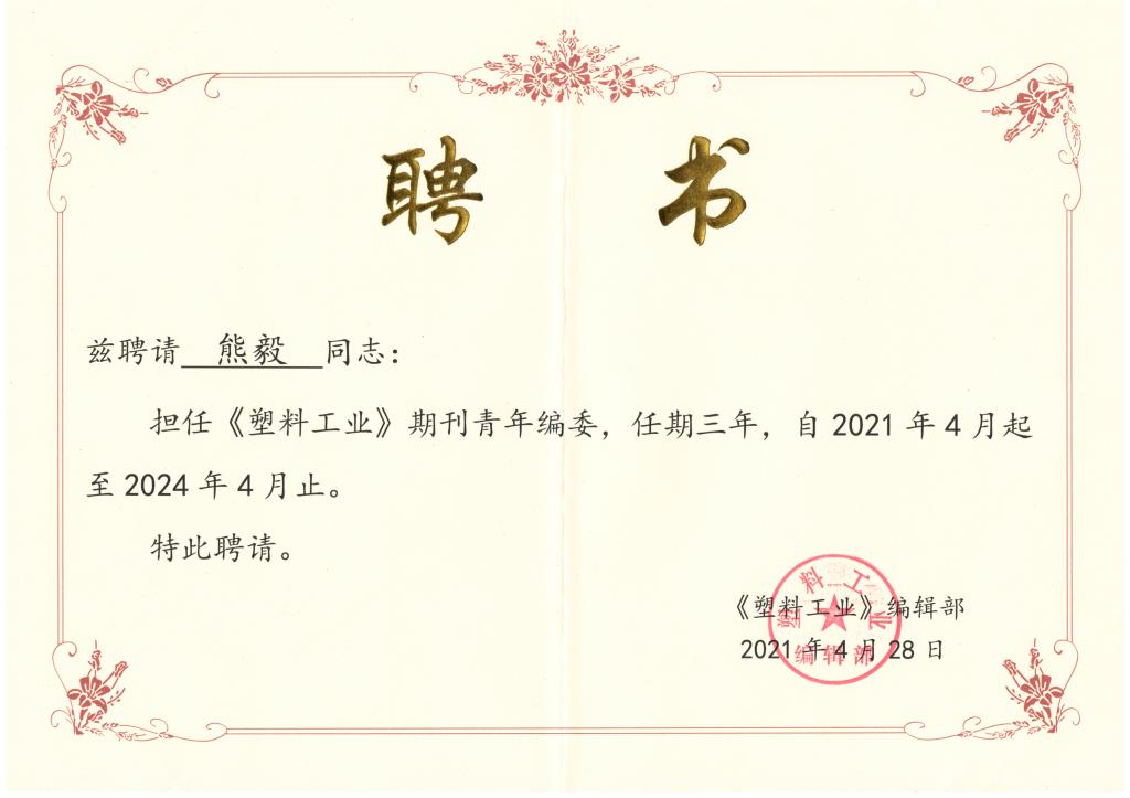 5月中旬,机械工程学院熊毅老师收到《塑料工业》杂志社聘书,被聘为青年编委。未来3年,他将与武汉大学、华中科技大学、四川大学等高校的青年学者们一道,通过学术交流、审稿等方面的工作,为推动塑料行业发展作贡