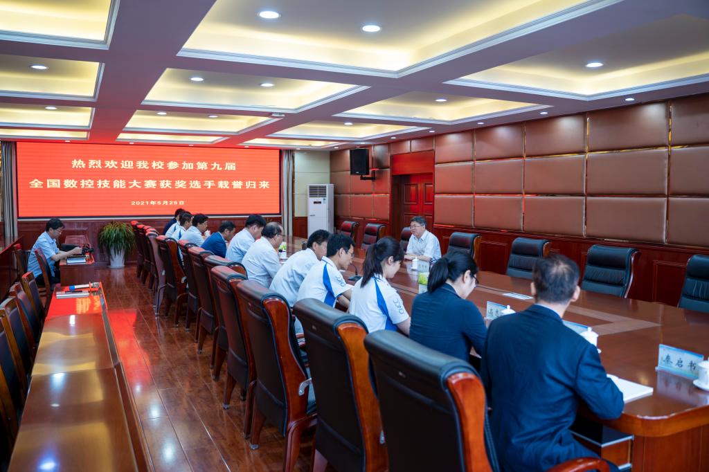 5月25日,河南省委军民融合发展委员会办公室常务副主任唐远游在学校孔明路校区4楼会议室亲切会见我校技能竞赛获奖选手。会议由校党委书记温道军主持,全体在家校领导、机械工程学院参赛队代表出席会议。温道军向