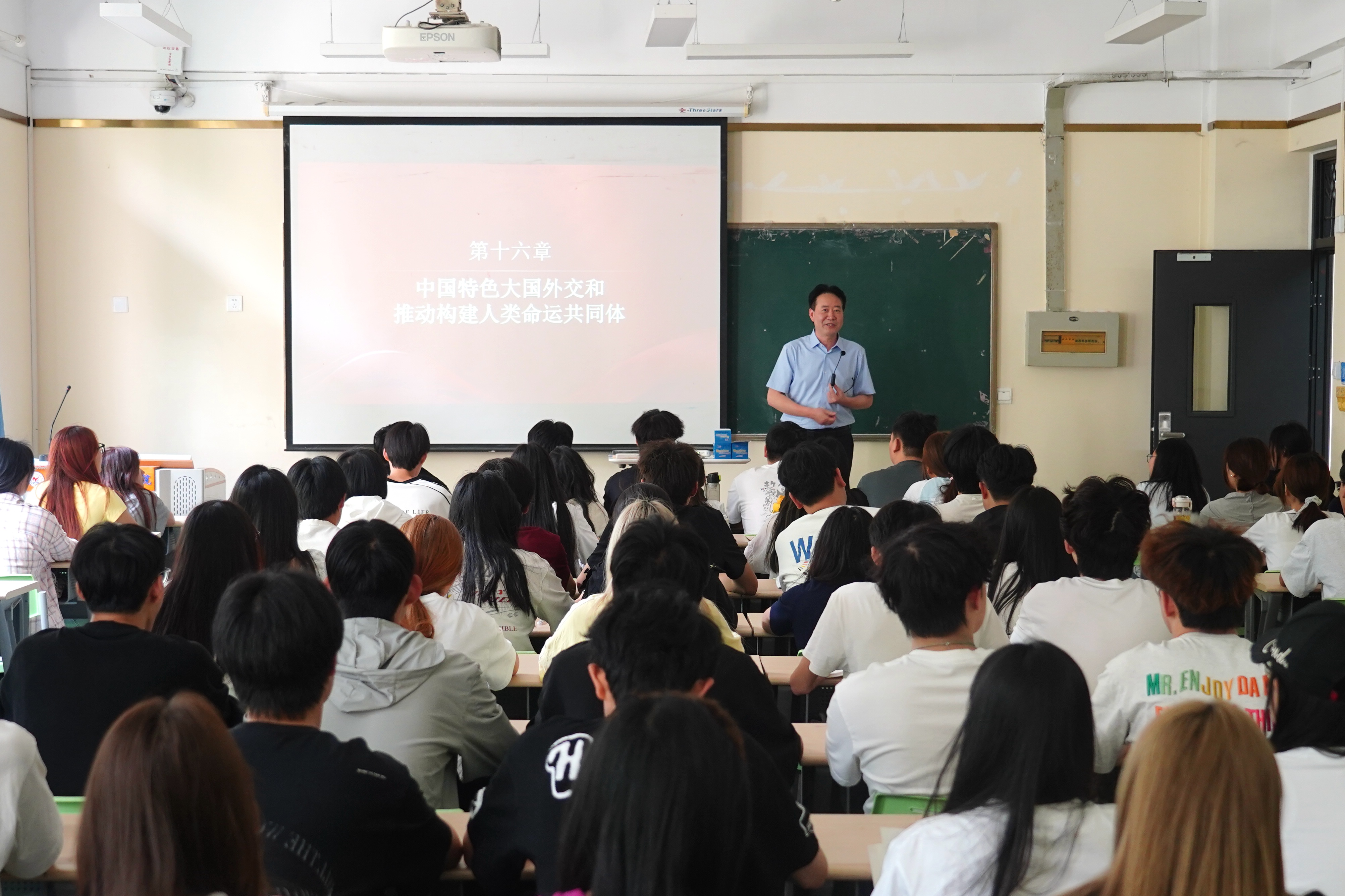为深入贯彻落实党的二十届三中全会和全国教育大会精神,落实《领导干部上讲台开展思想政治教育工作实施方法》系列要求,全面推进新时代学校思政课建设,5月28日下午,学校校长屈保中在孔明路校区X1206教室,为计应2401班和2402班讲授《习近平新时代中国特色社会主义思想概论》课。屈保中以“中国特色大国外交和推动构建人类命运共同体”为主题,系统讲授“世界怎么了——世界又站在历史的十字路口”“人类向何处去——中国方案:构建人类命运共同体”“中国怎么办?——全面推进中国特色大国外交”等教学内容,同学们认真聆听,对中国不仅是构建人类命运共同体的倡导者,也是实践者、贡献者和先行者有了更深的理解。屈保中希望同学们厚植爱党爱国情怀、奋进新征程,青年学子心怀“国之大者”“党之大计”,努力掌握核心科技自主自立自强,为了国家的繁荣昌盛和民族的伟大复兴努力学习、成长成才。(供稿/马克思主义学院 撰稿/王美华 摄影/杨爽 单位审核/白西乔 编审/ )