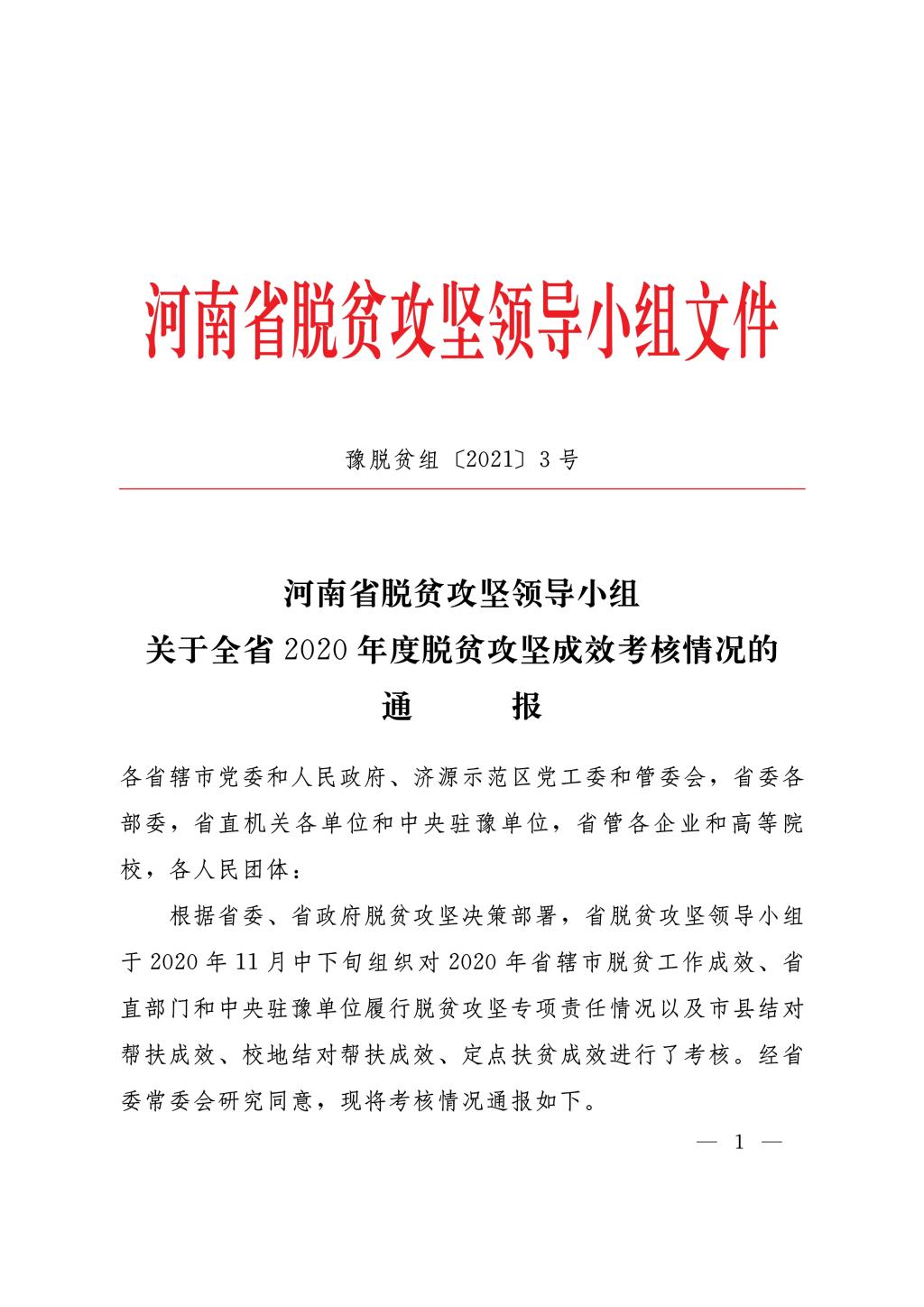 近日,河南省脱贫攻坚领导小组下发《关于全省2020年度脱贫攻坚成效考核情况的通报》(豫脱贫组﹝2021﹞3号)文件,我校作为承担校地结对帮扶的单位,被确定为综合评价“好”的高等院校,在全省校地结对帮扶