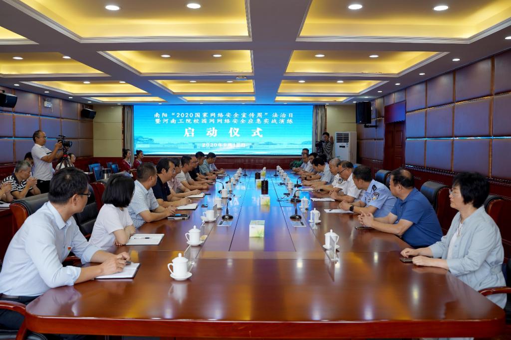 9月17日上午,南阳“2020国家网络安全宣传周”法治日暨河南工院校园网网络安全应急实战演练启动仪式在我校行政楼四楼会议室举办。南阳市公安局网络安全和技术侦察支队支队长李保山、校党委副书记杜建根、副校