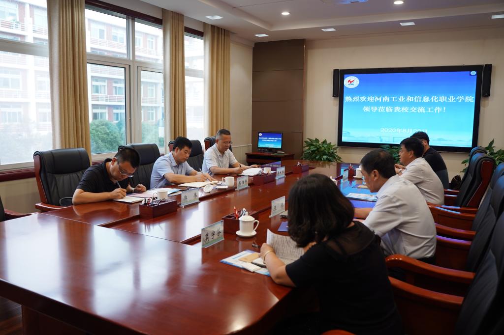 2020年8月20日,河南工业和信息化职业学院校长焦洪涛、副校长张庆伟、培训处处长郭伟等一行到我校交流访问,学校党委书记温道军、校长王伟、副校长贾庆成出席会议,继续教育学院院长莫宇芬和招生培训部主任刘