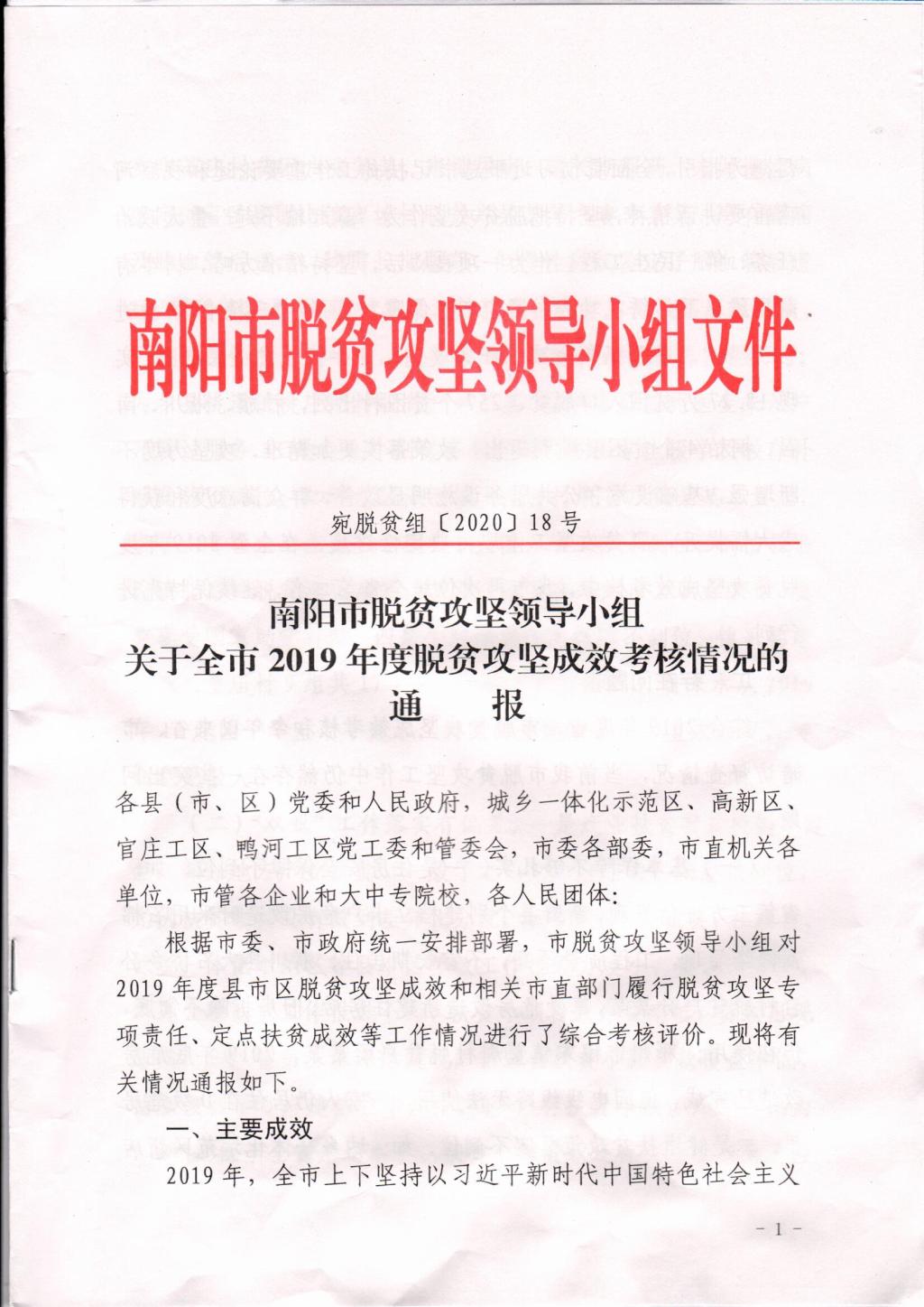 7月11日,在南阳市会议中心召开第十四次脱贫攻坚推进会,我校在南阳市脱贫攻坚领导小组印发《关于全市2019年度脱贫攻坚成效考核情况的通报》(宛脱贫组[2020]18号)中,荣获市派定点扶贫工作成效评价