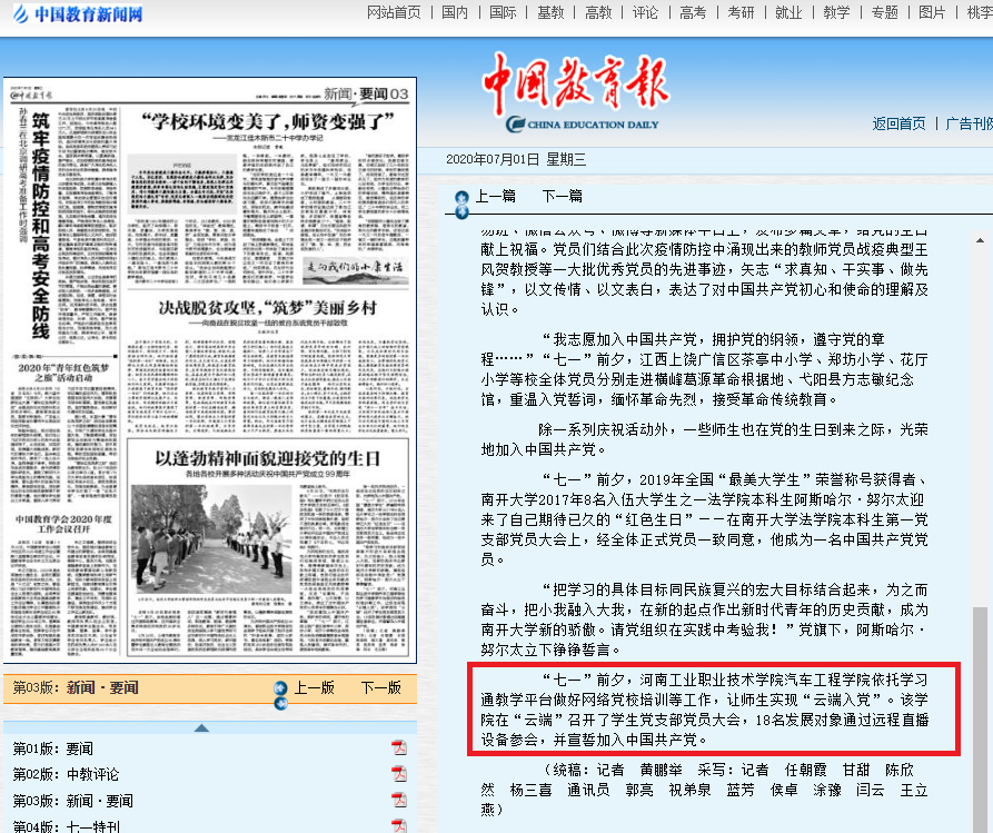 《人民日报》《中国教育报》《河南日报》、学习强国等多家媒体报道我校线上党建工作