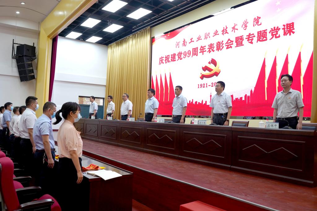 为庆祝中国共产党成立99周年,继承和发扬党的优良传统,进一步发挥党的核心引领作用,表彰先进、树立典范,激励广大党员进一步坚定信念、凝聚力量,6月30日下午,学校在孔明路校区学术报告厅举行庆祝建党99周