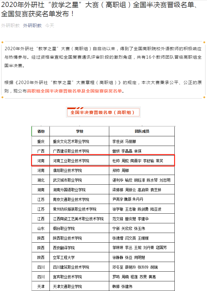 喜报!我校教师成功晋级2020年外研社“教学之星”大赛(高职组)全国半决赛