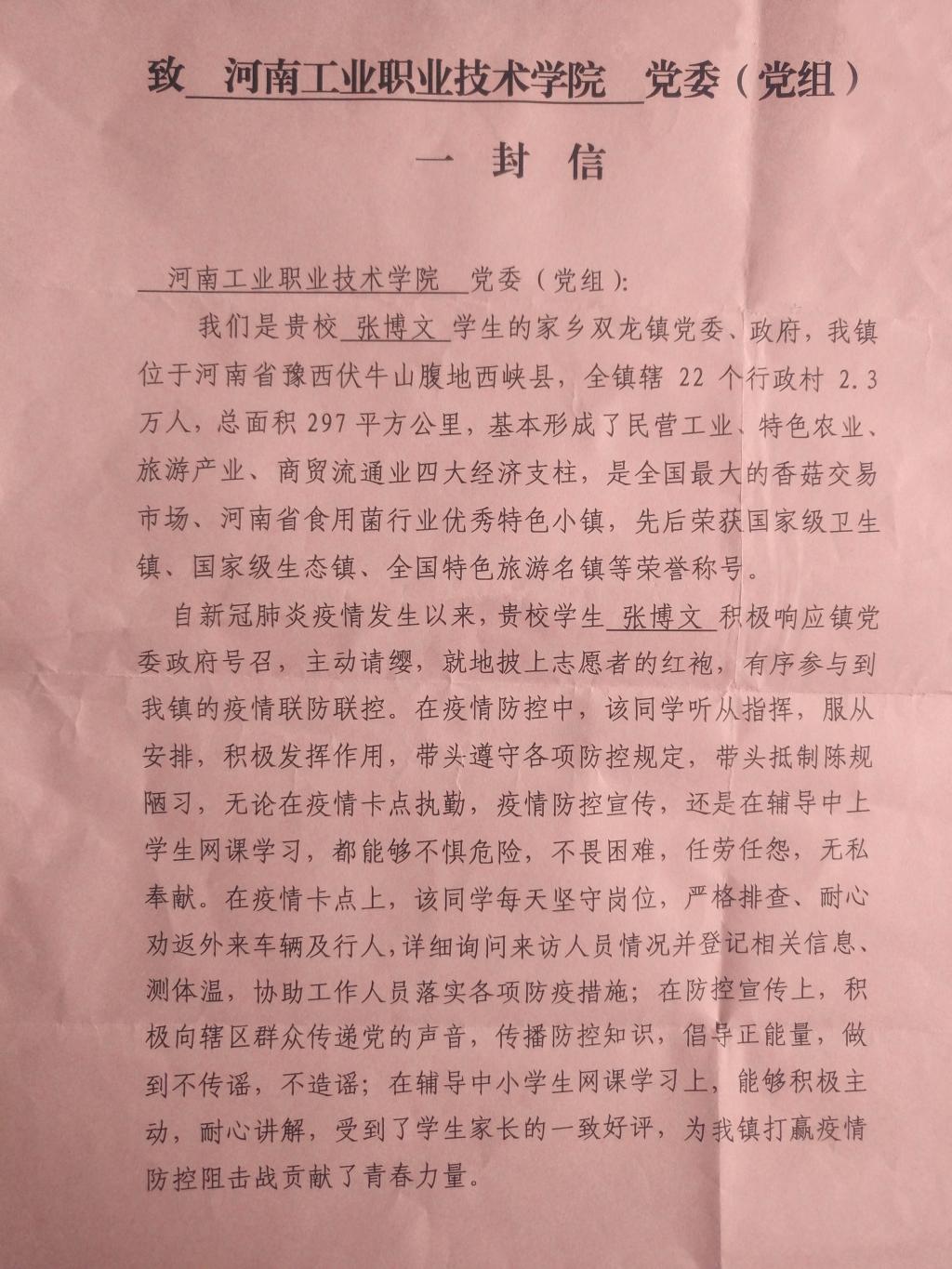 5月19日,学校收到一封来自西峡双龙镇人民政府的信,对我校机电自动化学院学生张博文在疫情防控中的积极表现给予充分肯定,对我校和培养出的优秀学生表示赞扬和感谢。新冠肺炎疫情发生以来,我校学生张博文积极响