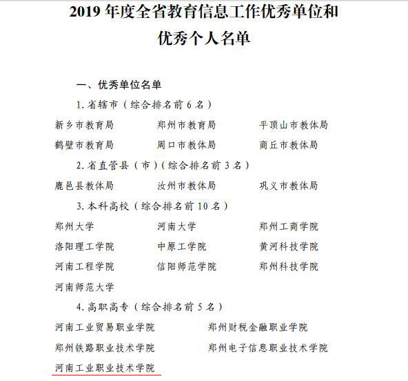 2月26日,中共河南省委高校工委、河南省教育厅印发《关于公布2019年度全省教育信息工作优秀单位和优秀个人的通知》(教办〔2020〕45号),我校荣获“2019年度全省教育信息工作优秀单位”称号,党政