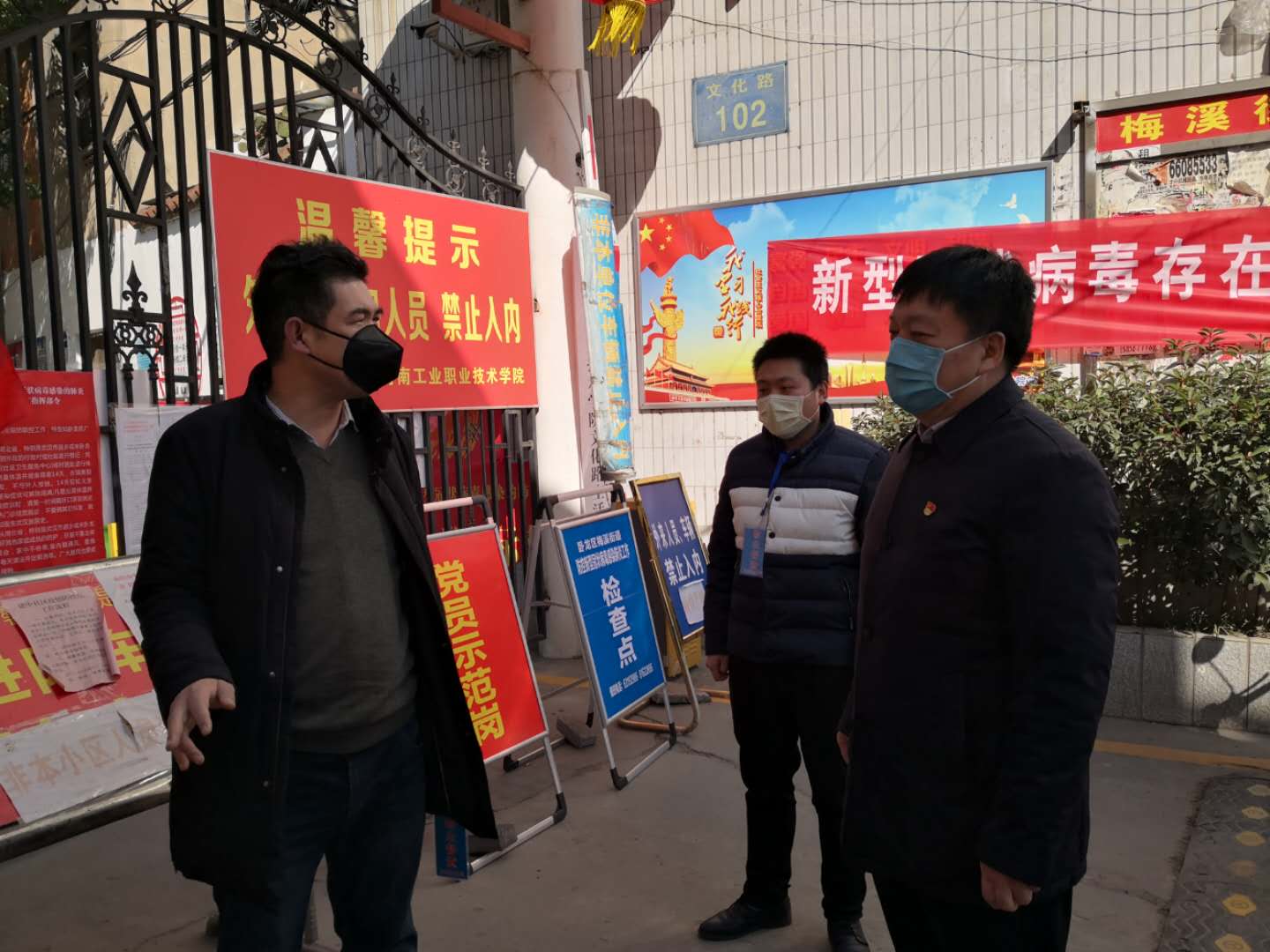 2月18日,党委书记温道军、副校长杜建根、王仁伟一行深入到文化路家属区、光武路校区、淯苑公寓、孔明路校区疫情防控一线,检查疫情防控值班值守情况,看望慰问坚守防控一线的值班值守人员。温道军详细了解了学校