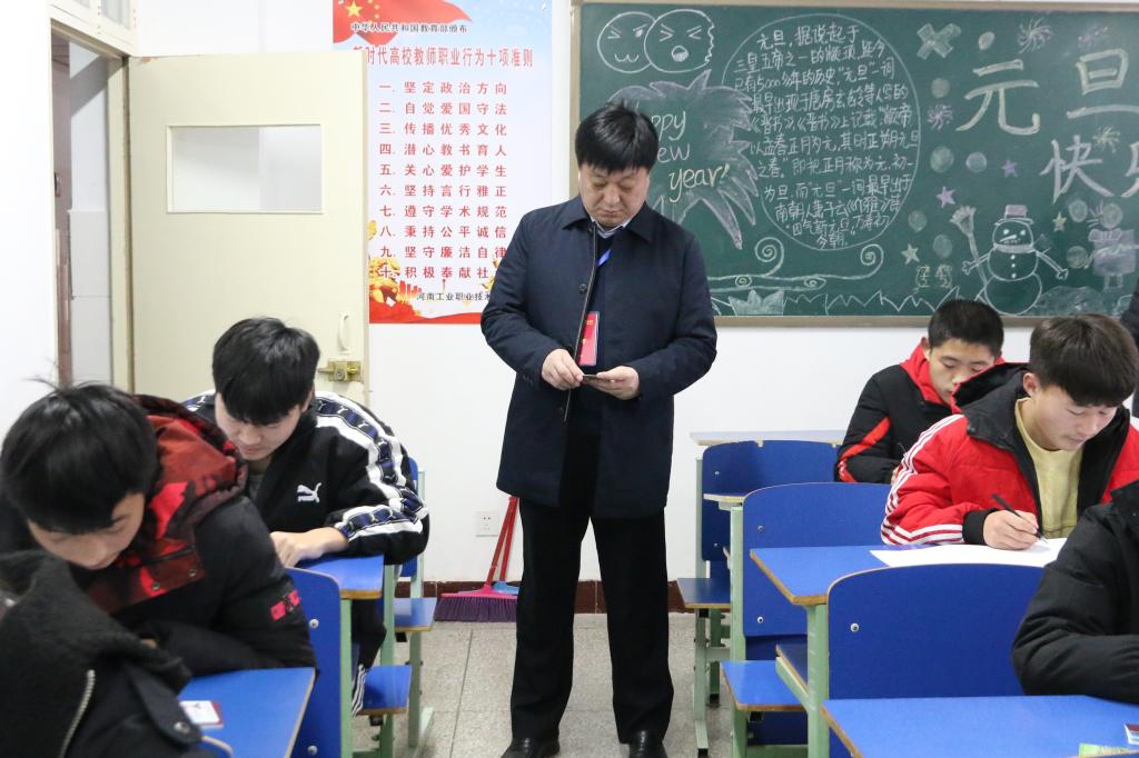 1月4日-8日为学校期末考试时间。学校领导高度重视期末考试的组织管理和考风考纪,1月4日,考试第一天,党委书记温道军,副校长杜建根、王仁伟,在党政办、教务处和有关院系负责人的陪同下,深入期末考试现场进
