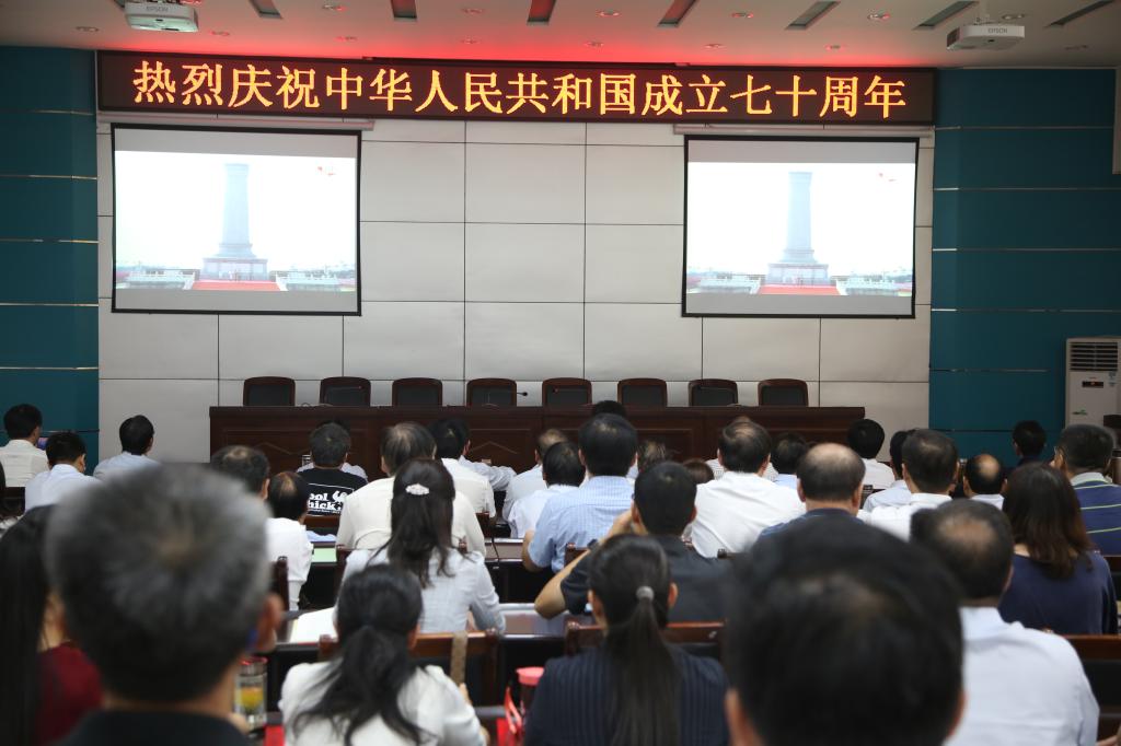 10月1日上午10时,学校在孔明路校区第一会议室主会场组织全体校领导和中层干部100多人收听收看“庆祝中华人民共和国成立70周年大会”盛况,与此同时,全校31个党总支、直属党支部和团委分别设立分会场组