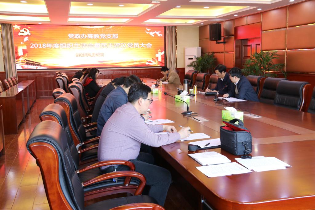 2019年3月26日,党政办高教党支部在办公楼四楼会议室召开2018年度组织生活会暨民主评议党员大会,党委书记胡龙廷同志以普通党员身份与支部其他党员一起参加会议。会议由支部书记马小兵同志主持。马小兵同