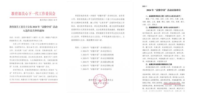 近日,教育部关工委和河南省教育厅关工委陆续发文公布全国高校和河南省属高校2024年“读懂中国”活动获奖名单。我校推荐的征文、微视频和舞台剧在省教育厅关工委评选中全部入选,其中2篇征文获省一等奖,1部微