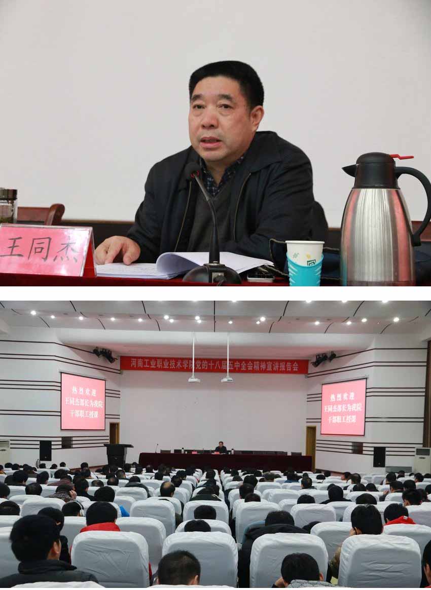 为进一步做好党的十八届五中全会精神的学习宣传落实,12月1日下午,学院特邀河南省十八大精神进基层集中宣讲团成员、河南省十八大精神分专题菜单式宣讲专家库成员、南阳市十八大精神、十八届三中、四、五全会精神