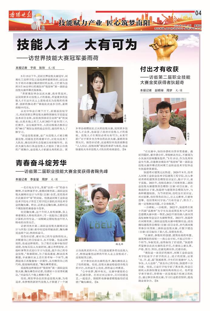 编者按:在南阳市“牧原杯”第一届职业技能大赛举办之际,为进一步弘扬劳动光荣、技能宝贵、创造伟大的时代风尚,5月16日,南阳日报、南阳晚报等媒体分别以《付出才有收获》《青春奋斗绽芳华》为题,对我校学生狄