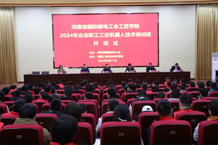 3月11日上午,河南省国防邮电工会工匠学院2024年首期培训班——企业职工工业机器人技术培训班在学校开班。河南省国防邮电工会主席杜振卿、副主席李立强,全国劳动模范、全国五一劳动奖章获得者、乐凯集团胶印