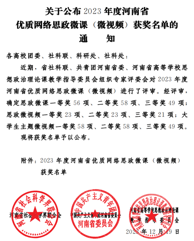 近日,河南省社会科学界联合会、共青团河南省委员会、河南省高等学校思想政治理论课教学指导委员会联合公布了2023年度河南省优质网络思政微课(微视频)获奖名单,我校思政课教师、团干部、辅导员和在校大学生共