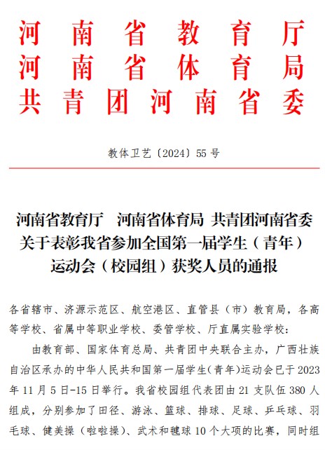 【喜报】我校学生吴晶瑜代表河南省参加中华人民共和国第一届学生(青年)运动会(校园组)获表彰