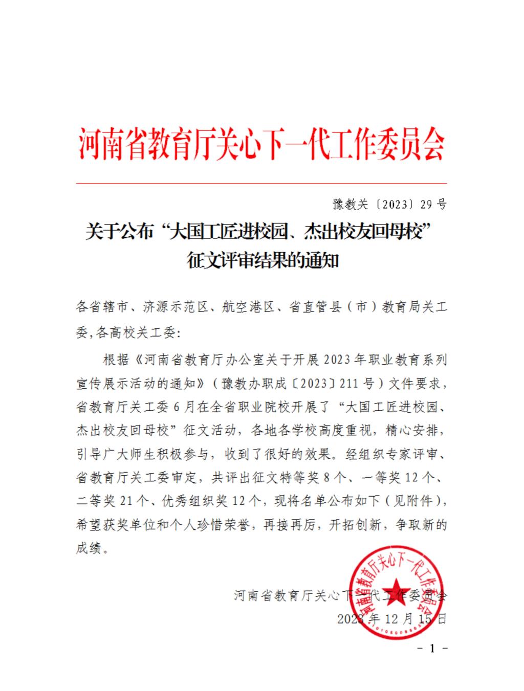 近日,河南省教育厅关工委公布了2023年度“大国工匠进校园、杰出校友回母校”征文活动获奖情况。我校师生获特等奖一项,一等奖一项,二等奖三项,学校获优秀组织奖。我校关工委高度重视本次活动,按照省教育厅关