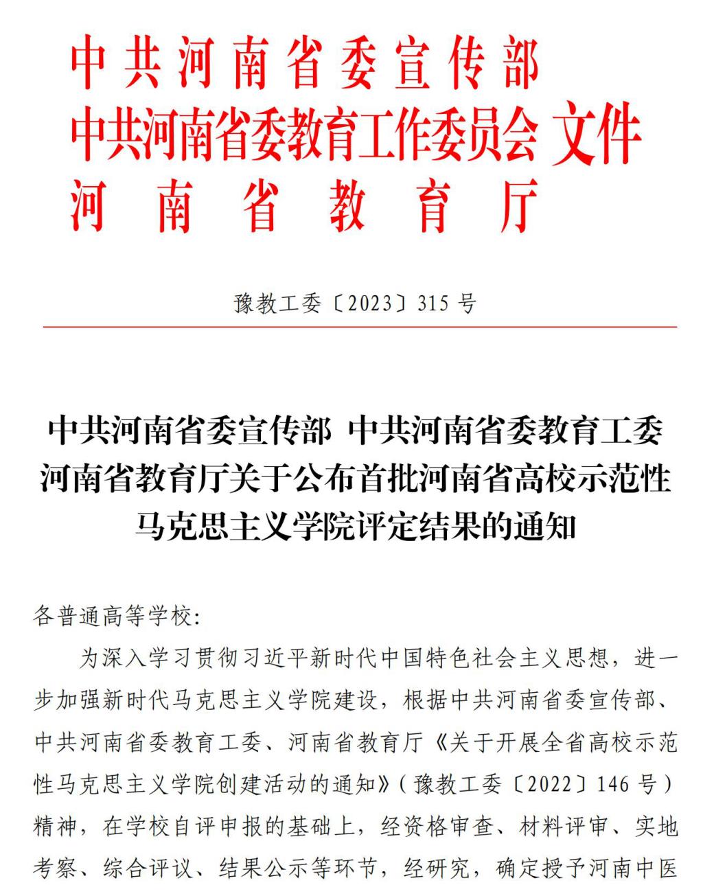 近日,中共河南省委宣传部、中共河南省委教育工委、河南省教育厅联合下发了《关于公布首批河南省高校示范性马克思主义学院评定结果的通知》(豫教工委〔2023〕315号),我校马克思主义学院被授予首批“河南省