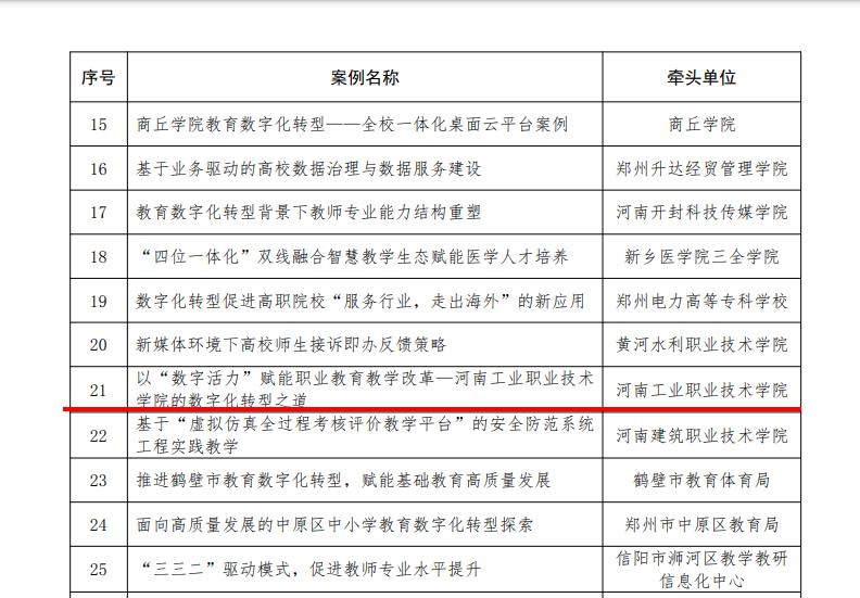 近日,河南省教育厅公布了2023年度教育数字化转型优秀案例,我校“以“数字活力”赋能职业教育教学改革—河南工业职业技术学院的数字化转型之道”案例成功入选。为贯彻落实习近平总书记关于教育的重要论述和数字