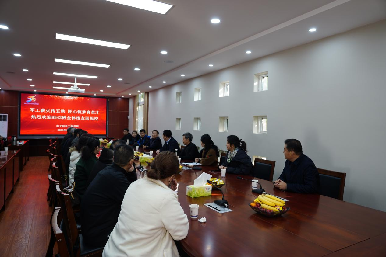 军工薪火传五秩,匠心筑梦育英才。11月14日,在建校50周年之际,学校迎来了8542班全体校友返校团聚,重温学生时代的青春记忆,共庆母校50华诞。座谈会在电子信息工程学院会议室举行,学校党委书记温道军