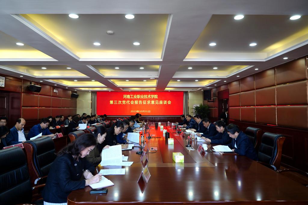 2023年10月31日上午,学校在新区第四会议室召开第三次党代会报告征求意见座谈会。校领导温道军、王伟、杜建根、王仁伟、樊有平、马小兵、侯同江出席座谈会。学校中层干部、民主党派、无党派人士、高级职称教