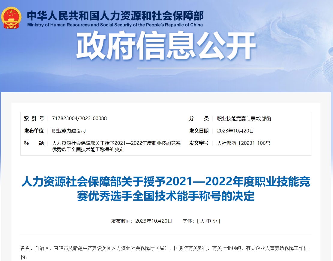 近日,人力资源社会保障部印发《人力资源社会保障部关于授予2021-2022年度职业技能竞赛优秀选手全国技术能手称号的决定》,向在2022年世界技能大赛特别赛、全国乡村振兴职业技能大赛、全国养老护理职业