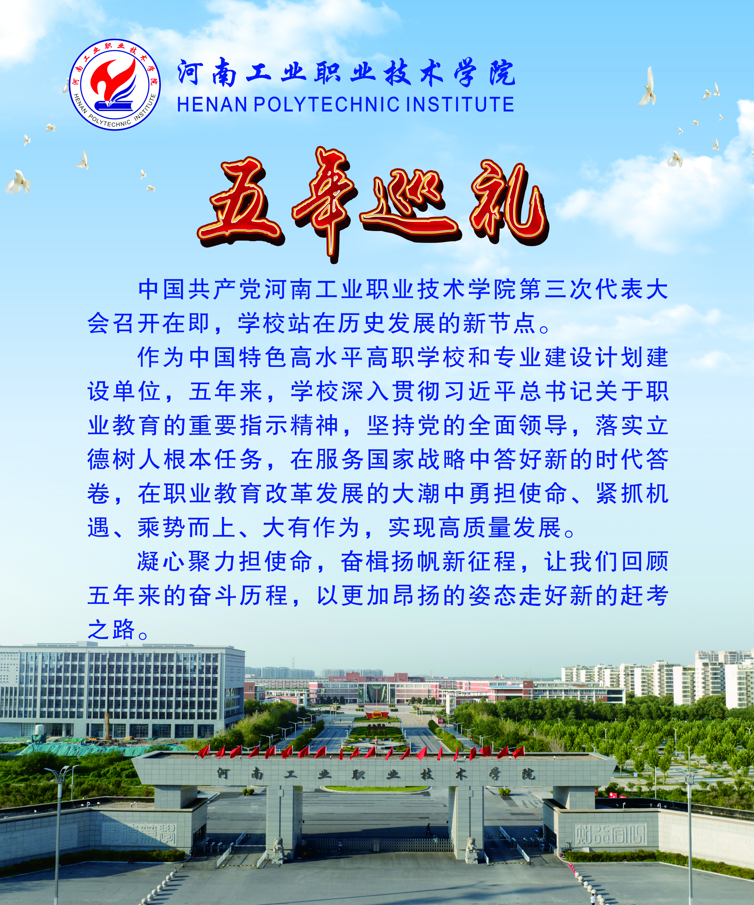 编者按:中国共产党河南工业职业技术学院第三次代表大会召开在即,学校站在新的历史发展节点。作为中国特色高水平高职学校和专业建设计划建设单位,五年来,学校深入贯彻习近平总书记关于职业教育的重要指示精神,坚