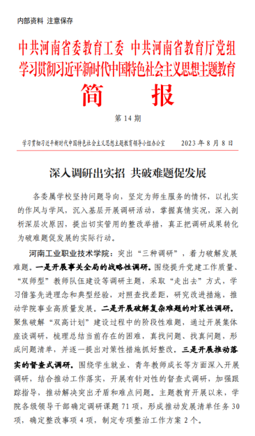 8月8日,省委教育工委、省教育厅主题教育领导小组办公室编印的主题教育简报2023年第14期,以《突出“三种调研”,着力破解发展》为题,从开展事关全局的战略性调研、开展破解复杂难题的对策性调研、开展推动