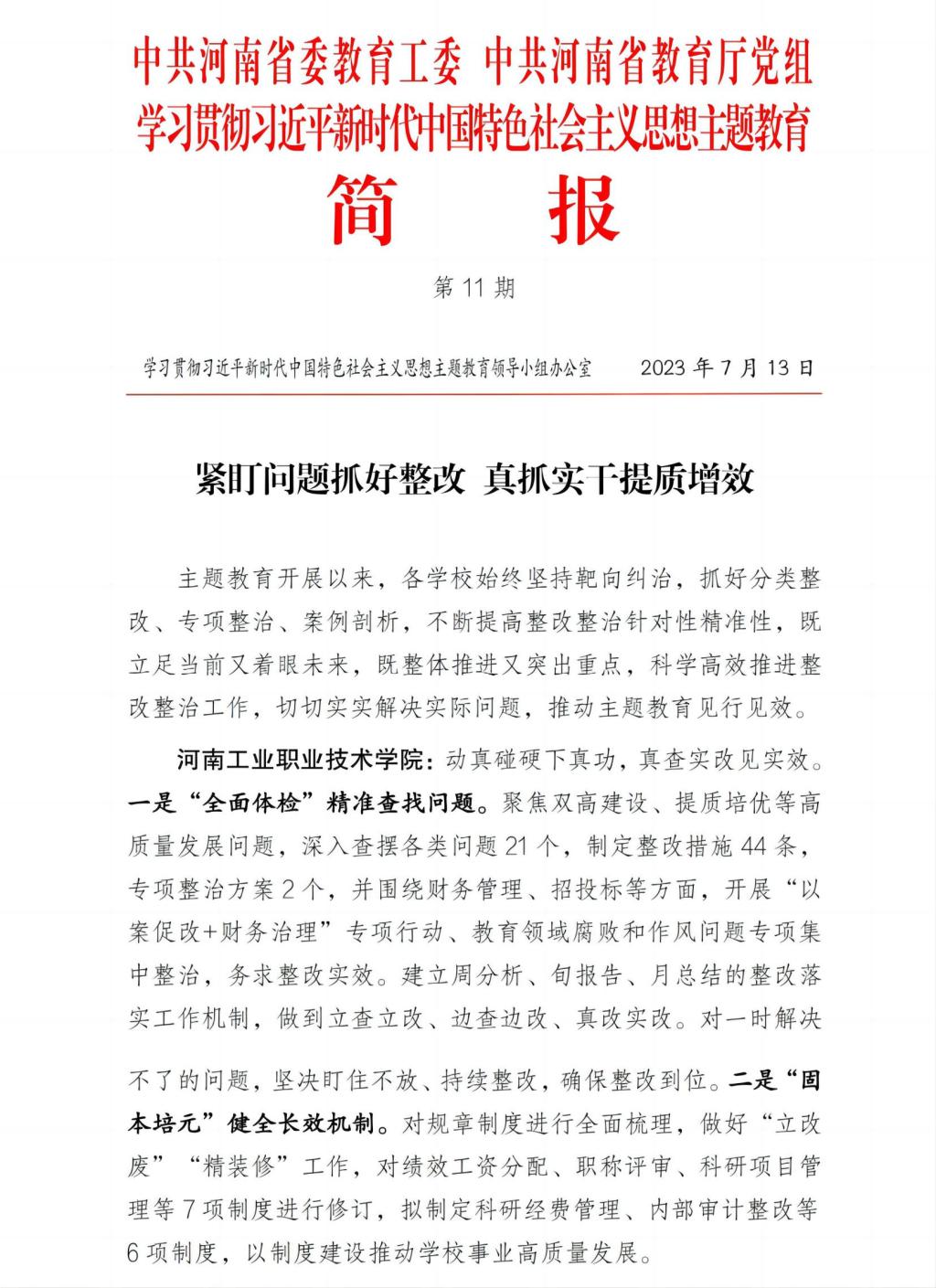 7月13日,省委教育工委、省教育厅主题教育领导小组办公室编印的主题教育简报2023年第11期,以《动真碰硬下真功,真查实改见实效》为题,从“全面体检”精准查找问题、“固本培元”健全长效机制两个方面,对