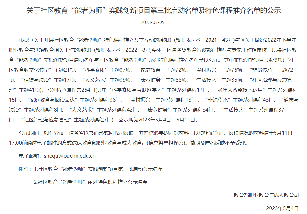 近日,教育部职业教育与成人教育司发布了社区教育“能者为师”实践创新项目第三批启动名单的公告。我校社区学院积极组织申报,基础科学教学部报送的实践创新项目《清风传万家入社区》,经省教育厅推荐、教育部组织专