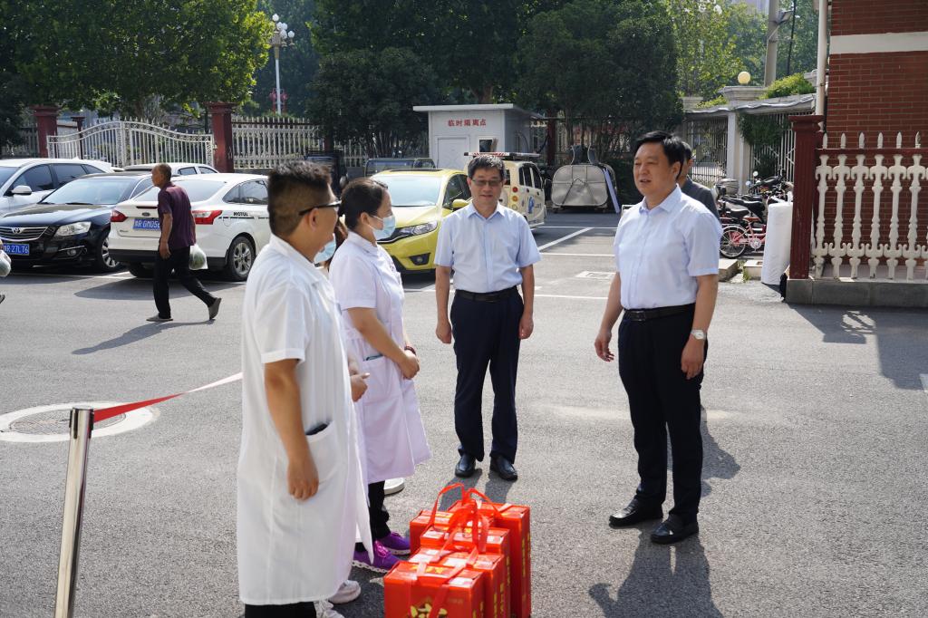 7月18日上午,学校党委书记温道军、副校长马小兵带领慰问团队,为学校的暑期值班和备赛的师生送去了清凉与关怀。慰问团队首先来到校医院,为值班医护人员送上了清凉解暑的慰问品,同时,温道军对医护人员们在炎炎