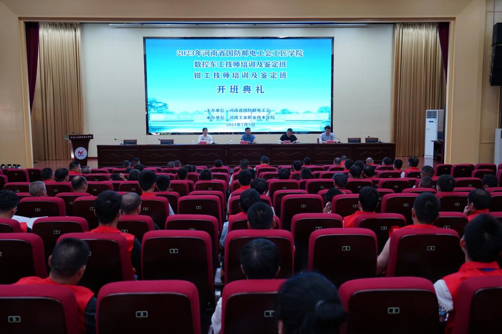 7月5日上午,河南省国防邮电工会工匠学院系列培训第七期数控车工技师培训及鉴定、第八期钳工技师培训及鉴定联合开班典礼在我校孔明路校区举行,省国防邮电工会兼职副主席、中国兵器工业集团河南平原光电有限公司数