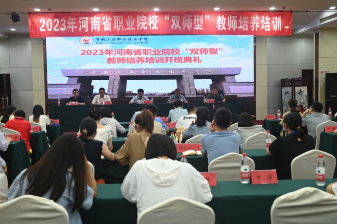 7月3日,2023年河南省职业院校“双师型”教师培养培训(建筑装饰工程技术/工程造价)开班典礼在我校举行,学校副校长贾庆成、河南天工建设集团有限公司总工程师姚建林、人力资源部经理焦书长出席开班典礼,继