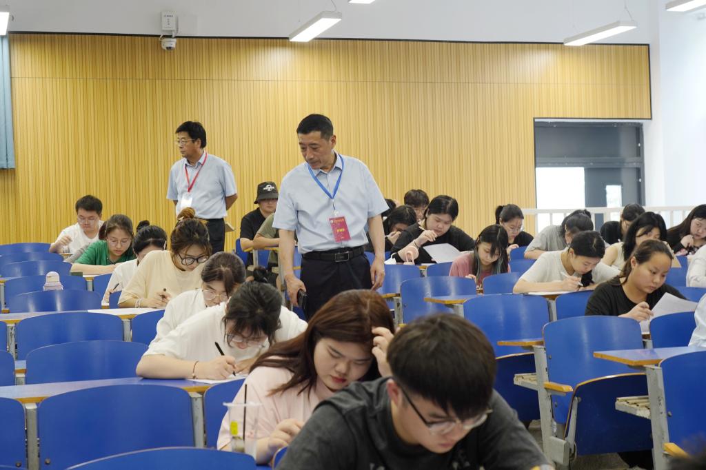 6月26日上午,学校校长王伟、副校长贾庆成在教务处等部门工作人员的陪同下,深入孔明路校区期末考试现场检查指导考试工作。检查过程中,王伟对考场秩序、考试组织、考场设施环境、监考教师履职及学生考纪等情况进