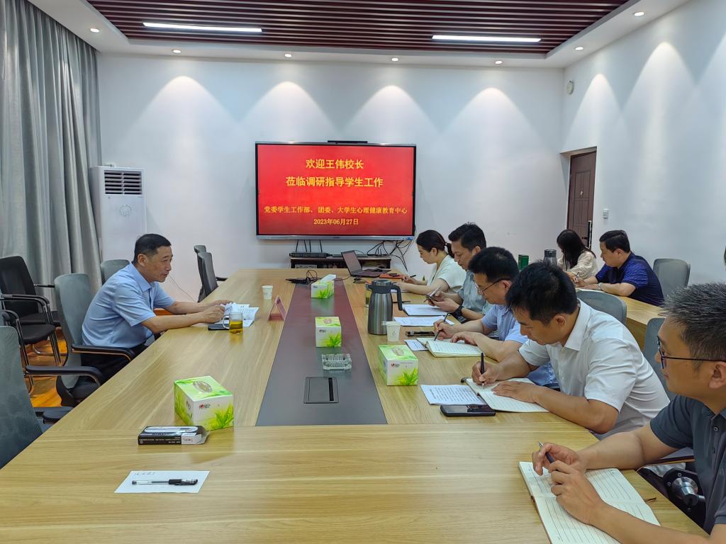 为深入开展学习贯彻习近平新时代中国特色社会主义思想主题教育,切实以高质量的调查研究推动学校高质量发展。6月27日下午,校长王伟深入党委学生工作部、团委、大学生心理健康教育中心开展学生工作专题调研。与会