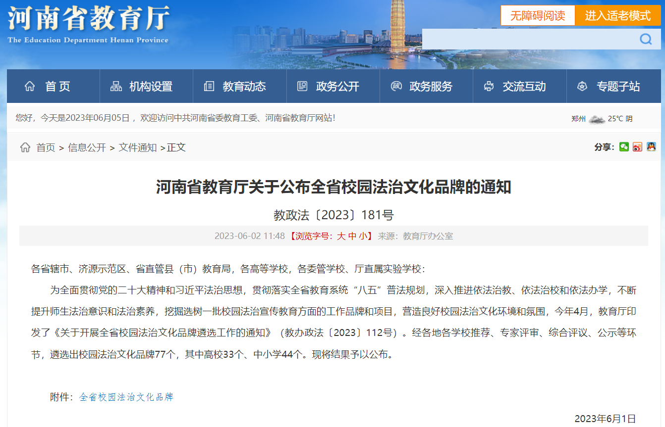 【喜报】学校“一三七”法治宣传教育工作法获评河南省校园法治文化品牌